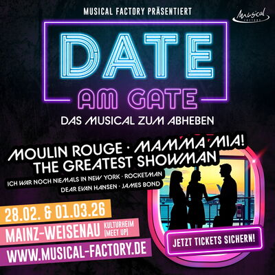 Am Samstag, 28.02.26 und Sonntag, 01.03.26 landet DATE AM GATE, das temporeiche und herzerwärmende Live-Erlebnis rund um Check-in-Chaos, Cocktails und große Gefühle in Mainz-Weisenau – ein Abend voller Liebe, Lachen und Lieblingssongs.